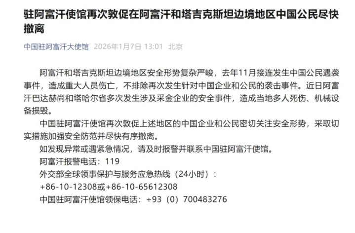 中国驻阿富汗使馆再次敦促上述地区的中国企业和公民密切关注安全形势,采取切实措施加强安全防范并尽快有序撤离。
